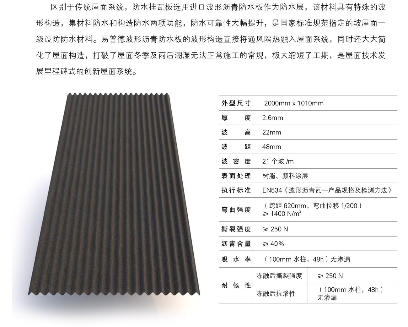 借鑒歐洲坡屋面防水理念,將平面防水改為立體防水,采用新型防水板材料,將材料防水和構造防水于一身,配合屋面系統組件,實現全天候全干作業。節(jié)省了屋面各類保護層次,打破了屋面冬季及雨后陰濕無法施工的常規(guī),縮短了工期,提升系統安全性能。